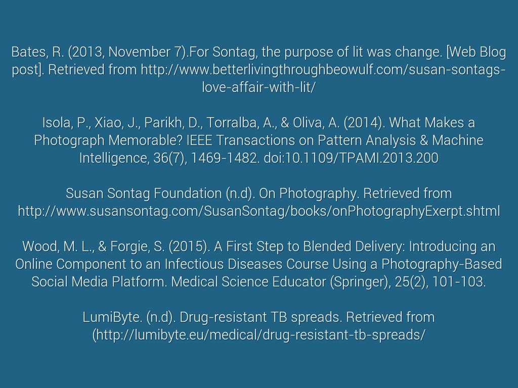 Wood, M. L., & Forgie, S. (2015). A First Step to Blended Delivery: Introducing an Online Component to an Infectious Diseases Course Using a Photography-Based Social Media Platform. Medical Science Educator (Springer), 25(2), 101-103.