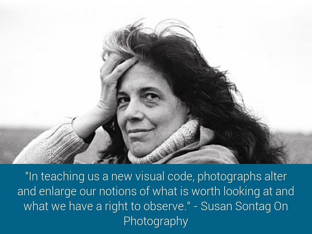 "In teaching us a new visual code, photographs alter and enlarge our notions of what is worth looking at and what we have a right to observe." - Susan Sontag On Photography