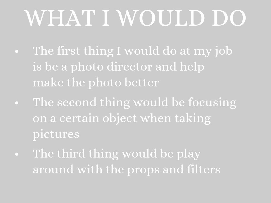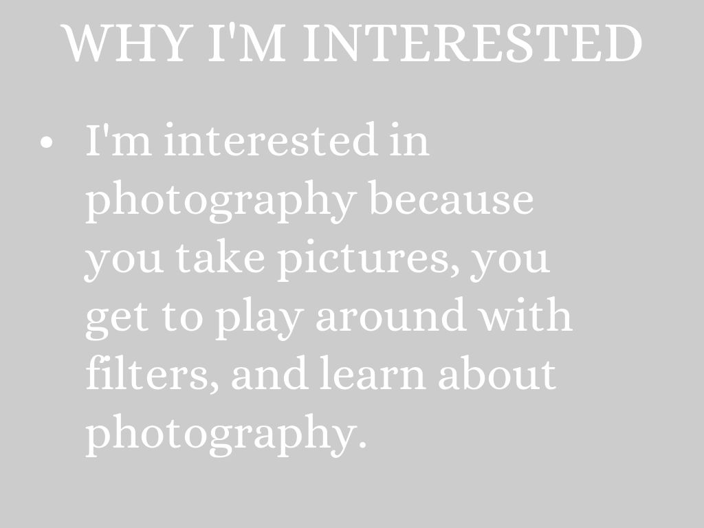 I'm interested in photography because you take pictures, you get to play around with filters, and learn about photography.