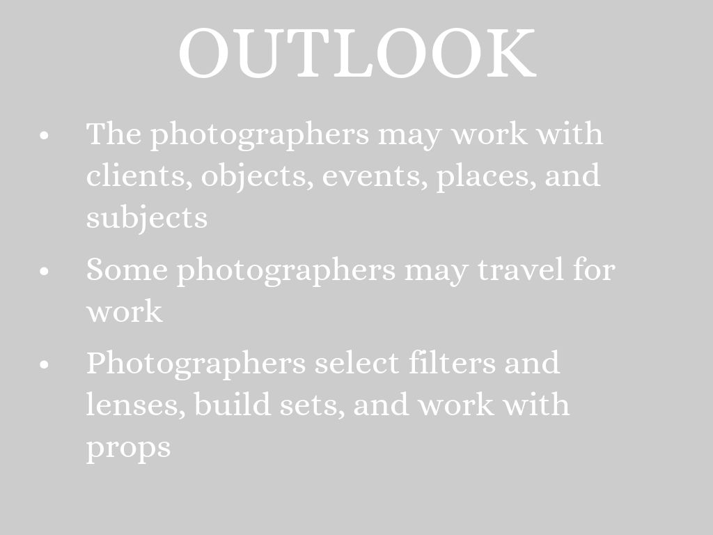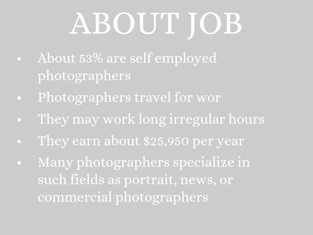 Many photographers specialize in such fields as portrait, news, or commercial photographers