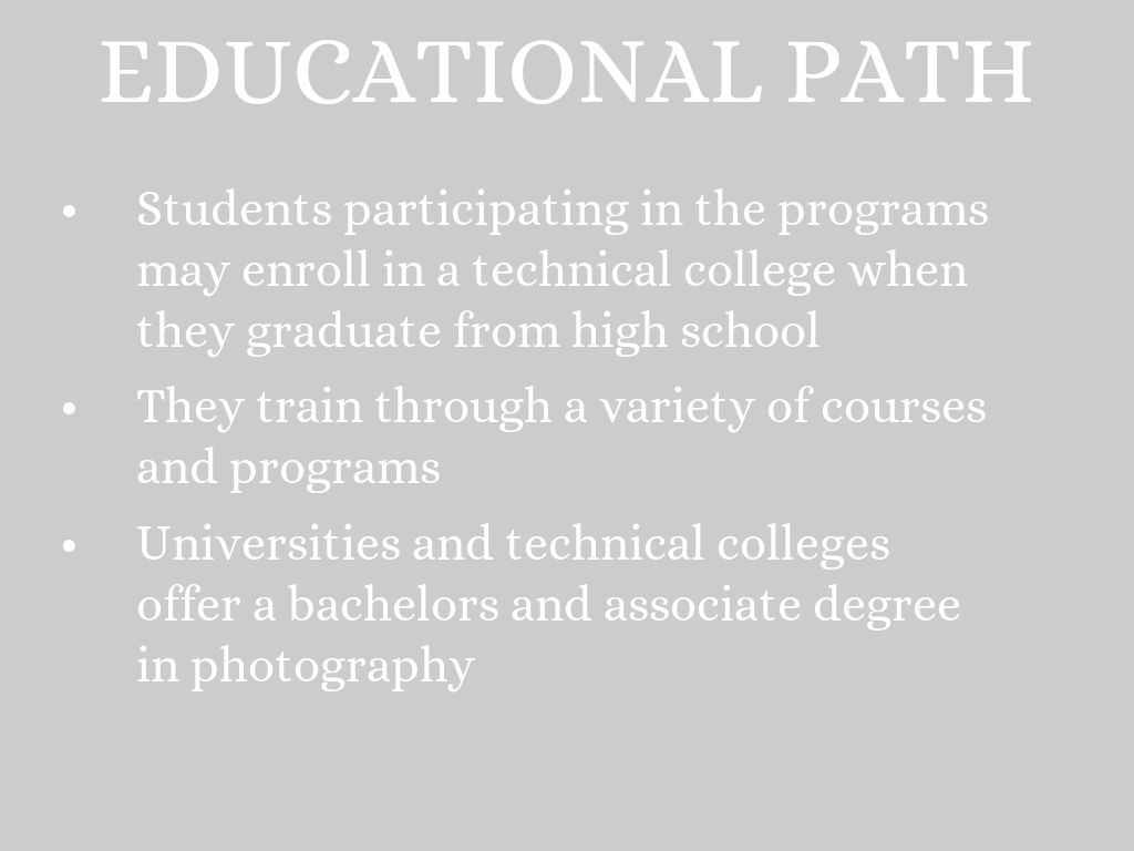 Universities and technical colleges offer a bachelors and associate degree in photography