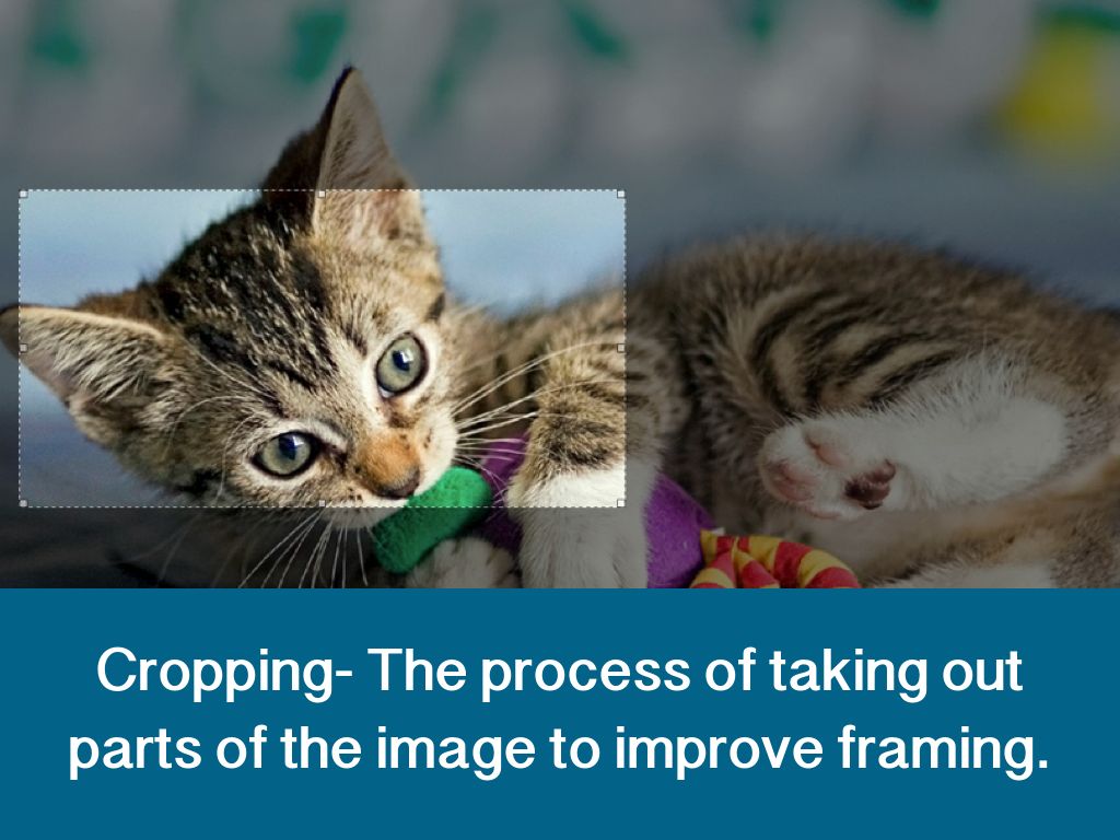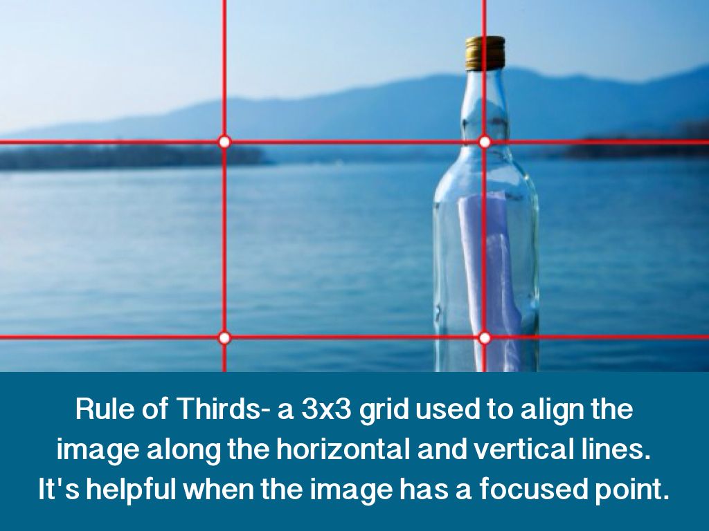 Rule of Thirds- a 3x3 grid used to align the image along the horizontal and vertical lines. It's helpful when the image has a focused point.