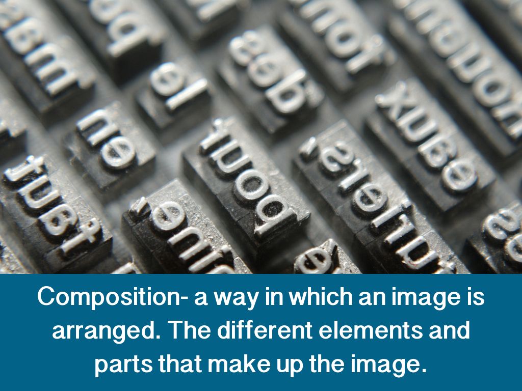 Composition- a way in which an image is arranged. The different elements and parts that make up the image.