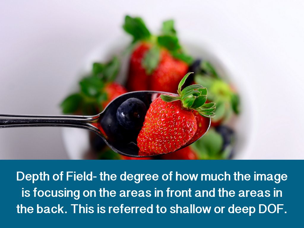 Depth of Field- the degree of how much the image is focusing on the areas in front and the areas in the back. This is referred to shallow or deep DOF.