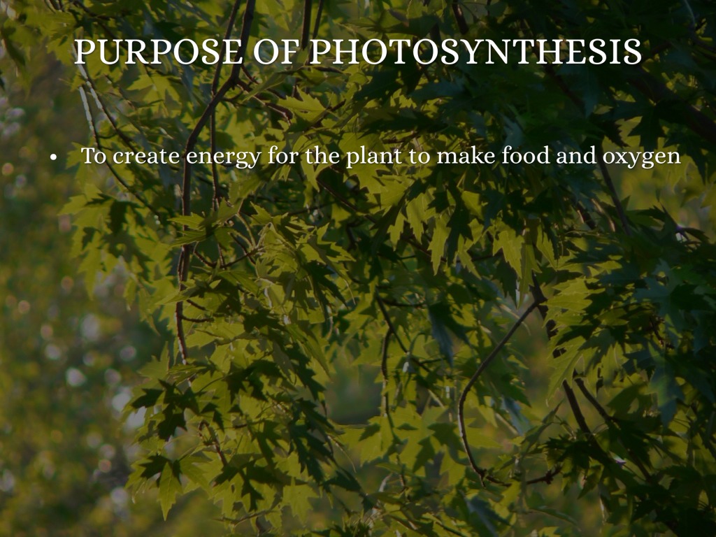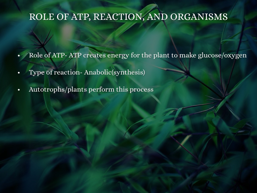 • Role of ATP- ATP creates energy for the plant to make glucose/oxygen