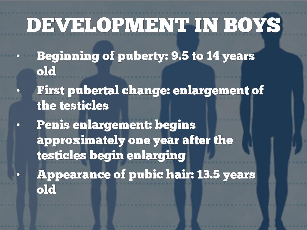 • Penis enlargement: begins approximately one year after the testicles begin enlarging