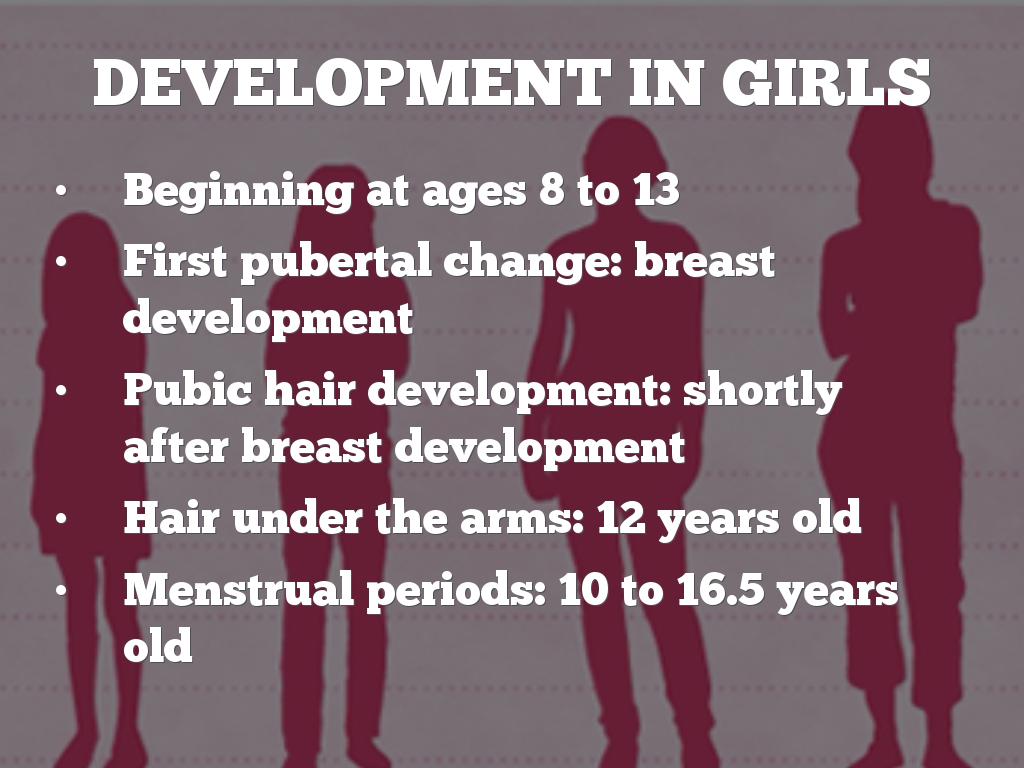 • Hair under the arms and on the face, voice change, and acne: 15 years old