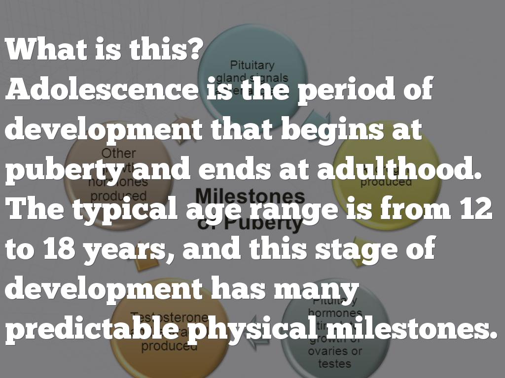 Adolescence is the period of development that begins at puberty and ends at adulthood. The typical age range is from 12 to 18 years, and this stage of development has many predictable physical milestones.