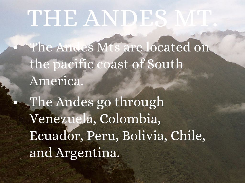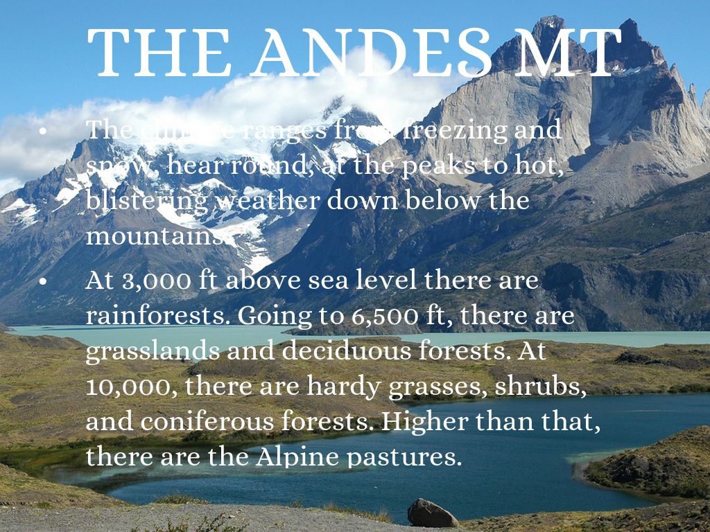 The climate ranges from freezing and snow, hear round, at the peaks to hot, blistering weather down below the mountains.