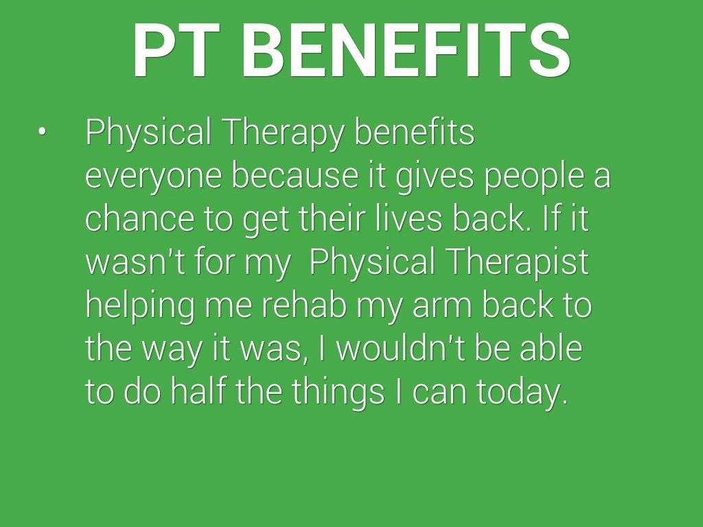 - Physical Therapy benefits everyone because it gives people a chance to get their lives back. If it wasn't for my Physical Therapist helping me rehab my arm back to the way it was, I wouldn't be able to do half the things I can today.