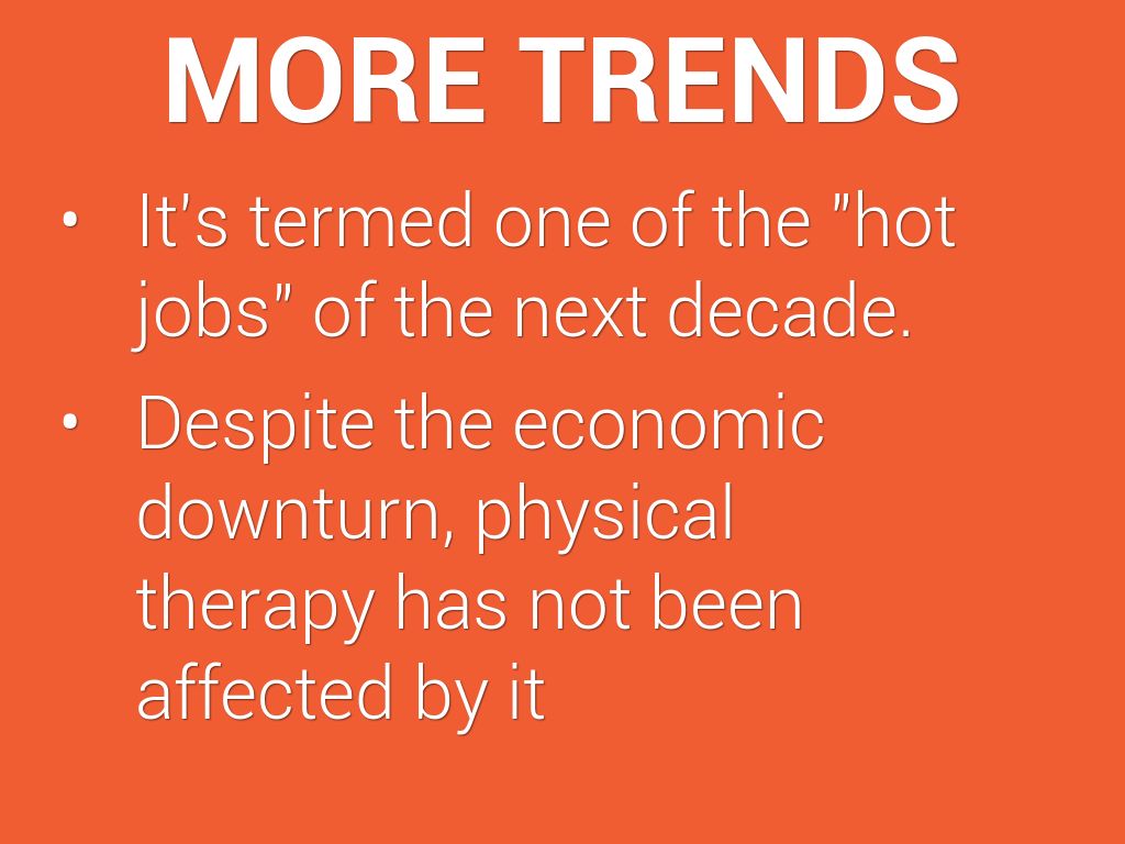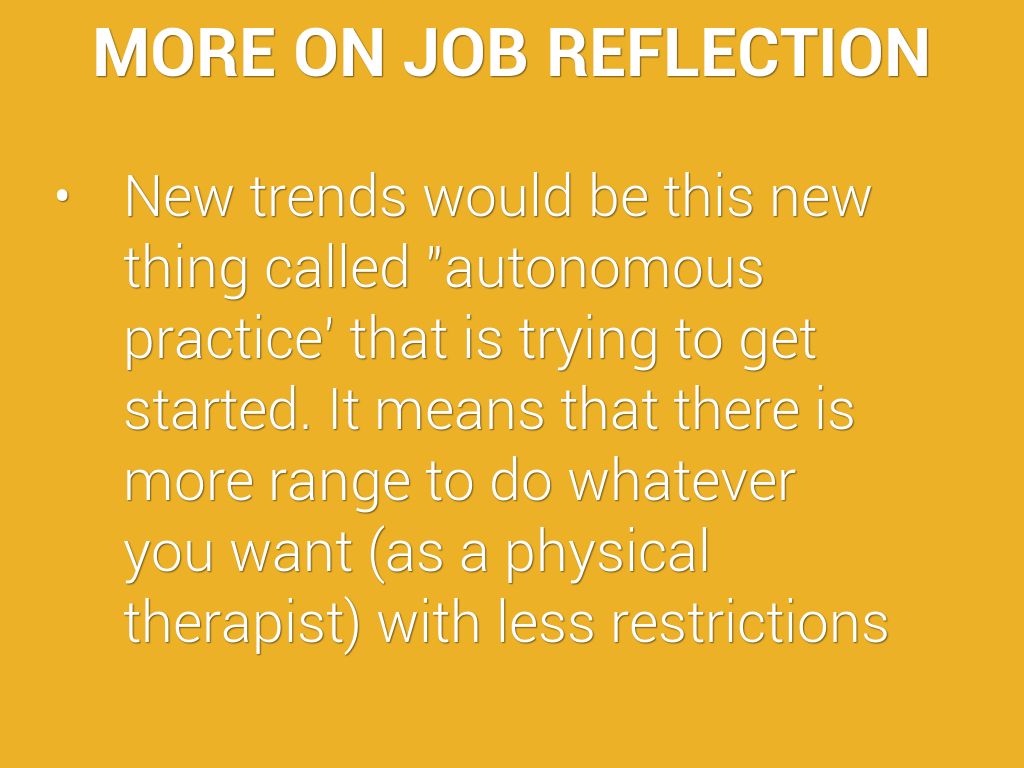 - New trends would be this new thing called "autonomous practice' that is trying to get started. It means that there is more range to do whatever you want (as a physical therapist) with less restrictions