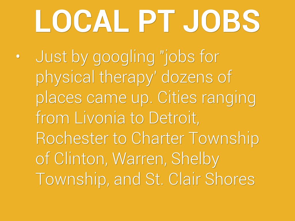 - Just by googling "jobs for physical therapy' dozens of places came up. Cities ranging from Livonia to Detroit, Rochester to Charter Township of Clinton, Warren, Shelby Township, and St. Clair Shores