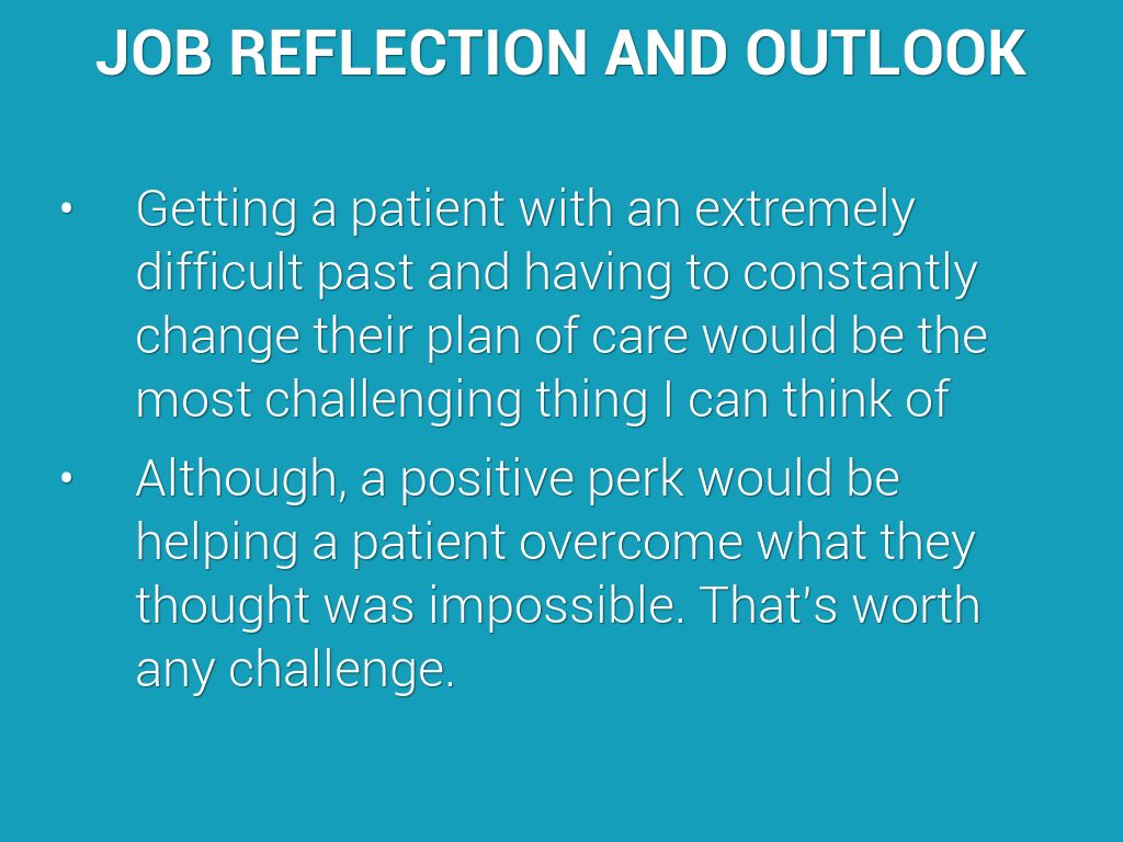 - Getting a patient with an extremely difficult past and having to constantly change their plan of care would be the most challenging thing I can think of