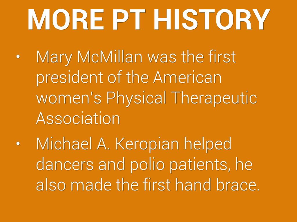 - Mary McMillan was the first president of the American women's Physical Therapeutic Association