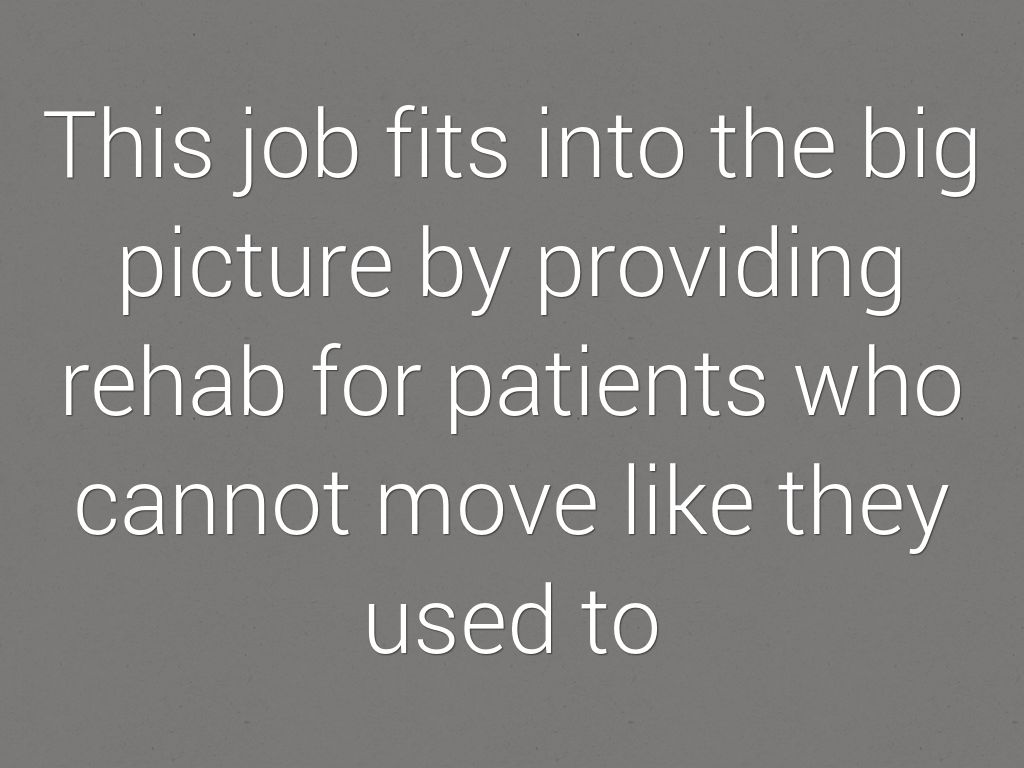 This job fits into the big picture by providing rehab for patients who cannot move like they used to