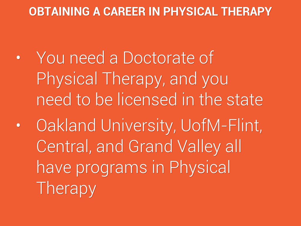 - Oakland University, UofM-Flint, Central, and Grand Valley all have programs in Physical Therapy