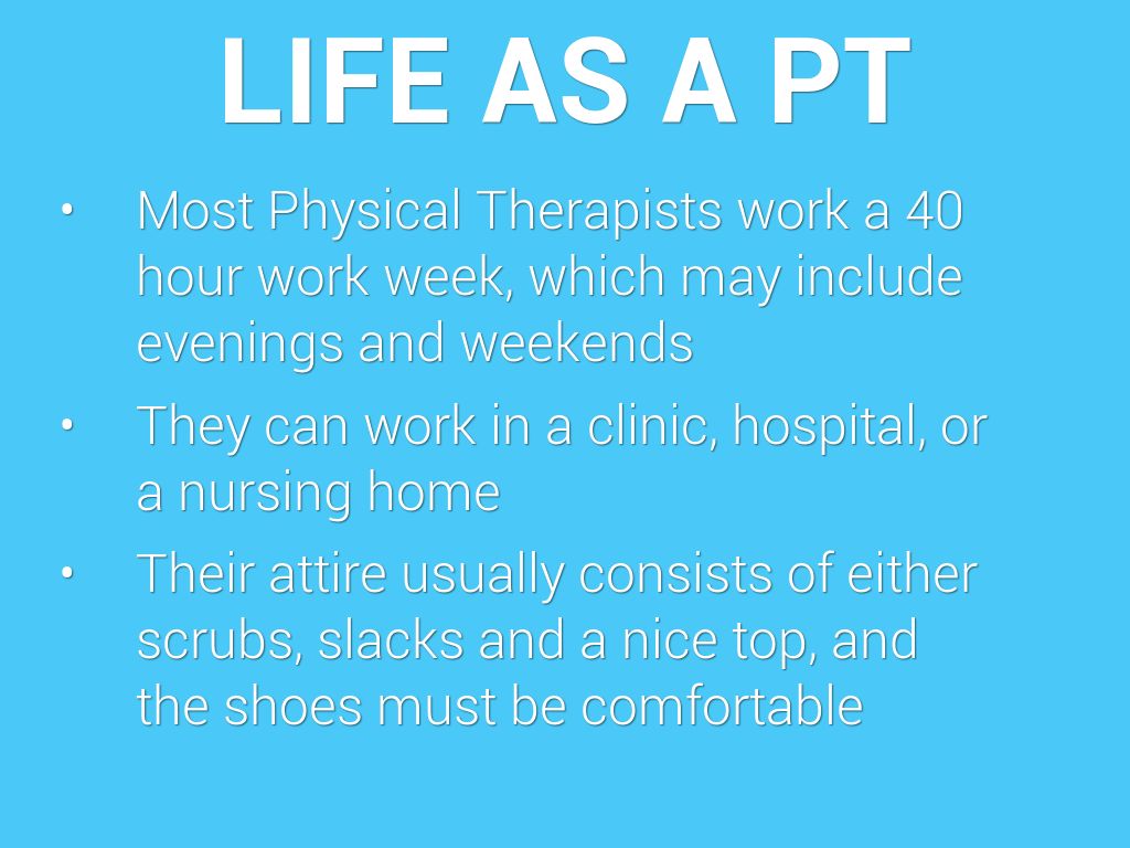 - Most Physical Therapists work a 40 hour work week, which may include evenings and weekends
