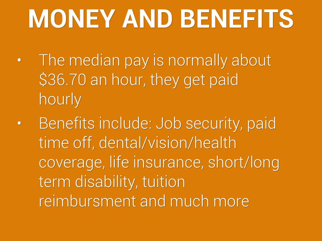- Benefits include: Job security, paid time off, dental/vision/health coverage, life insurance, short/long term disability, tuition reimbursment and much more