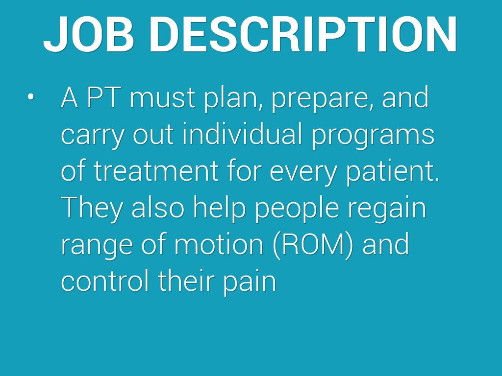 - A PT must plan, prepare, and carry out individual programs of treatment for every patient. They also help people regain range of motion (ROM) and control their pain