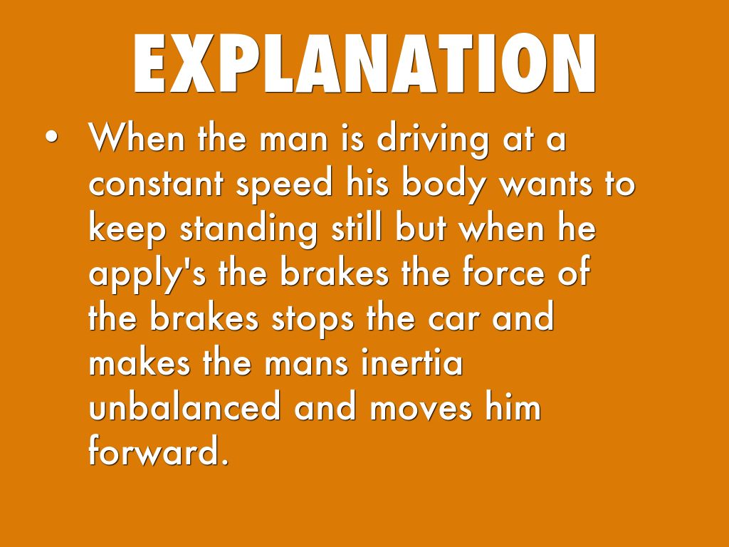 When the man is driving at a constant speed his body wants to keep standing still but when he apply's the brakes the force of the brakes stops the car and makes the mans inertia unbalanced and moves him forward.
