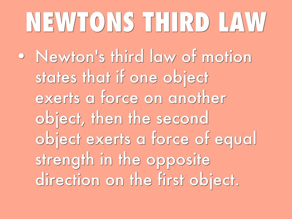 Newton's third law of motion states that if one object exerts a force on another object, then the second object exerts a force of equal strength in the opposite direction on the first object.