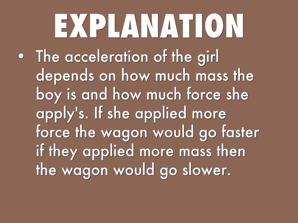 The acceleration of the girl depends on how much mass the boy is and how much force she apply's. If she applied more force the wagon would go faster if they applied more mass then the wagon would go slower.