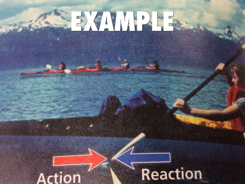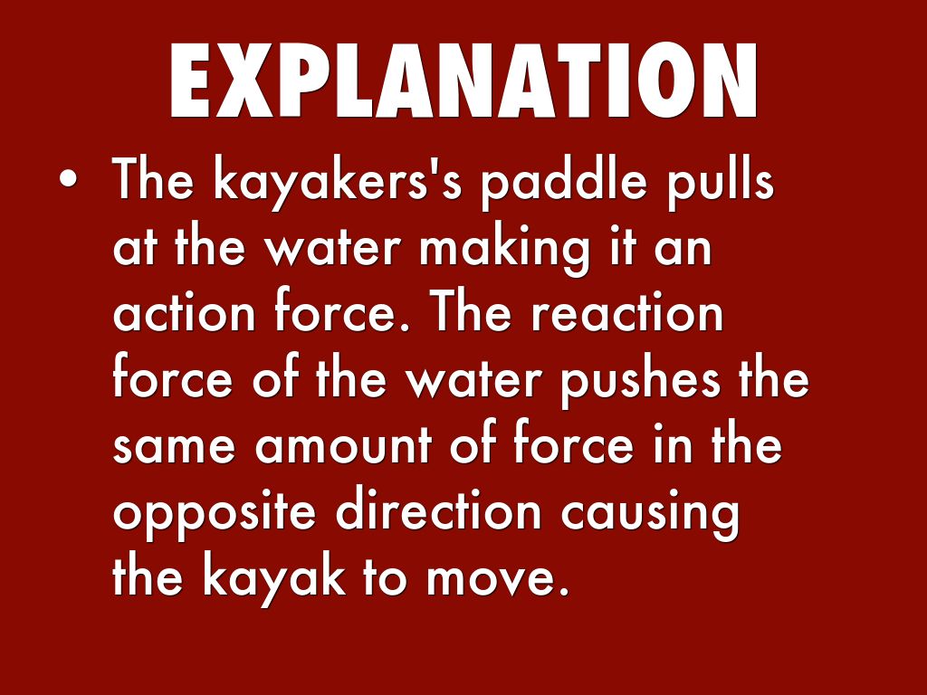 The kayakers's paddle pulls at the water making it an action force. The reaction force of the water pushes the same amount of force in the opposite direction causing the kayak to move.