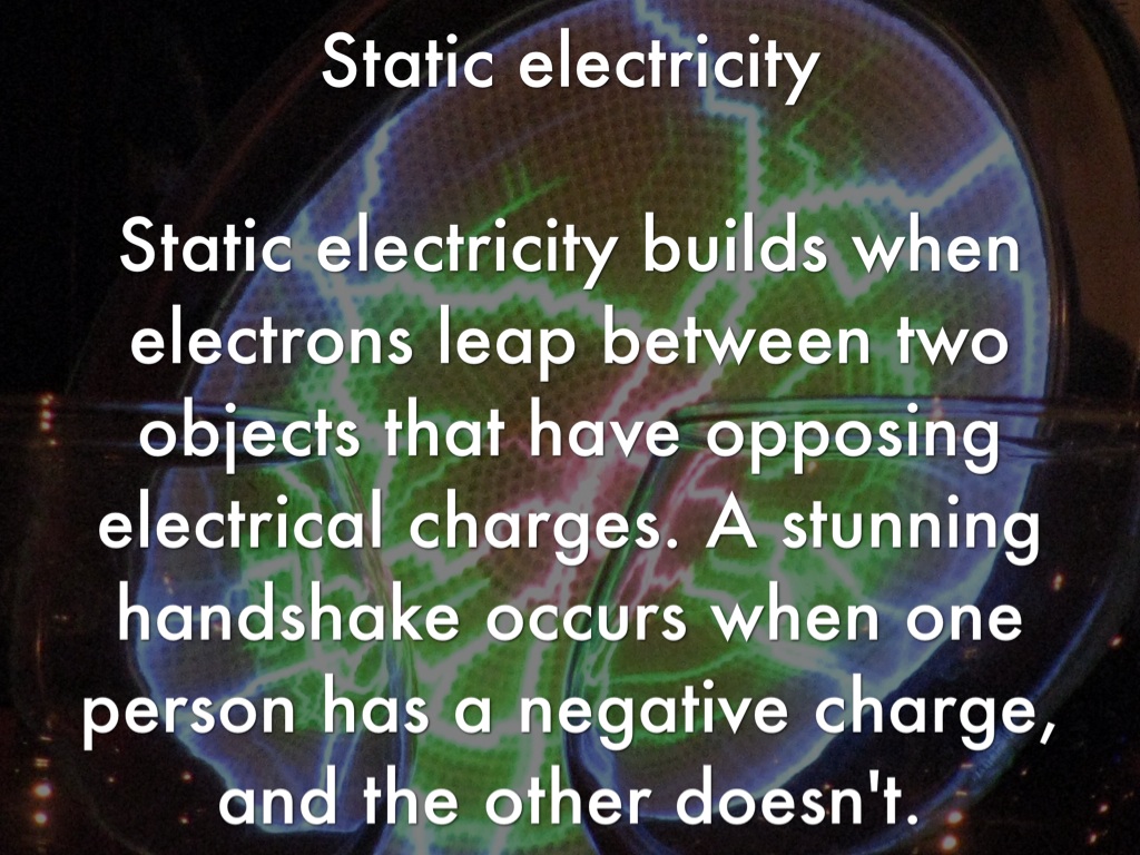 Static electricity builds when electrons leap between two objects that have opposing electrical charges. A stunning handshake occurs when one person has a negative charge, and the other doesn't.