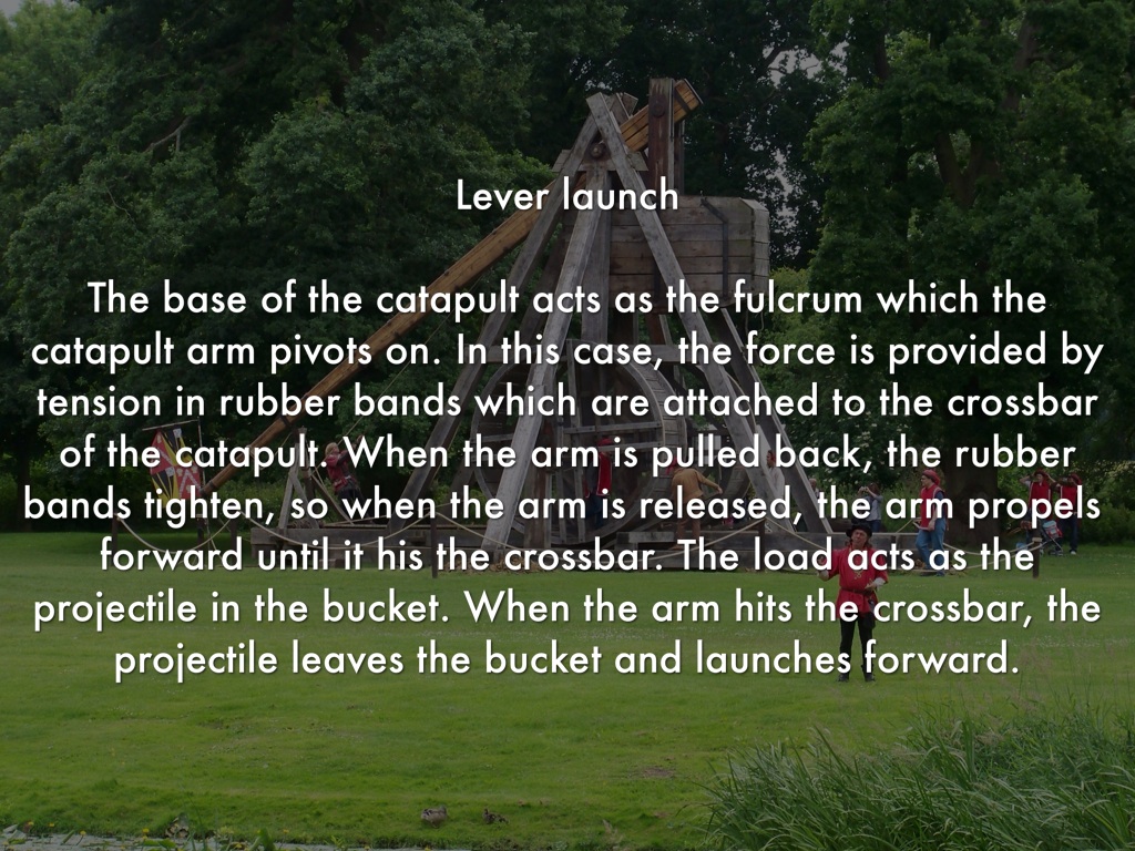 The base of the catapult acts as the fulcrum which the catapult arm pivots on. In this case, the force is provided by tension in rubber bands which are attached to the crossbar of the catapult. When the arm is pulled back, the rubber bands tighten, so when the arm is released, the arm propels forward until it his the crossbar. The load acts as the projectile in the bucket. When the arm hits the crossbar, the projectile leaves the bucket and launches forward.