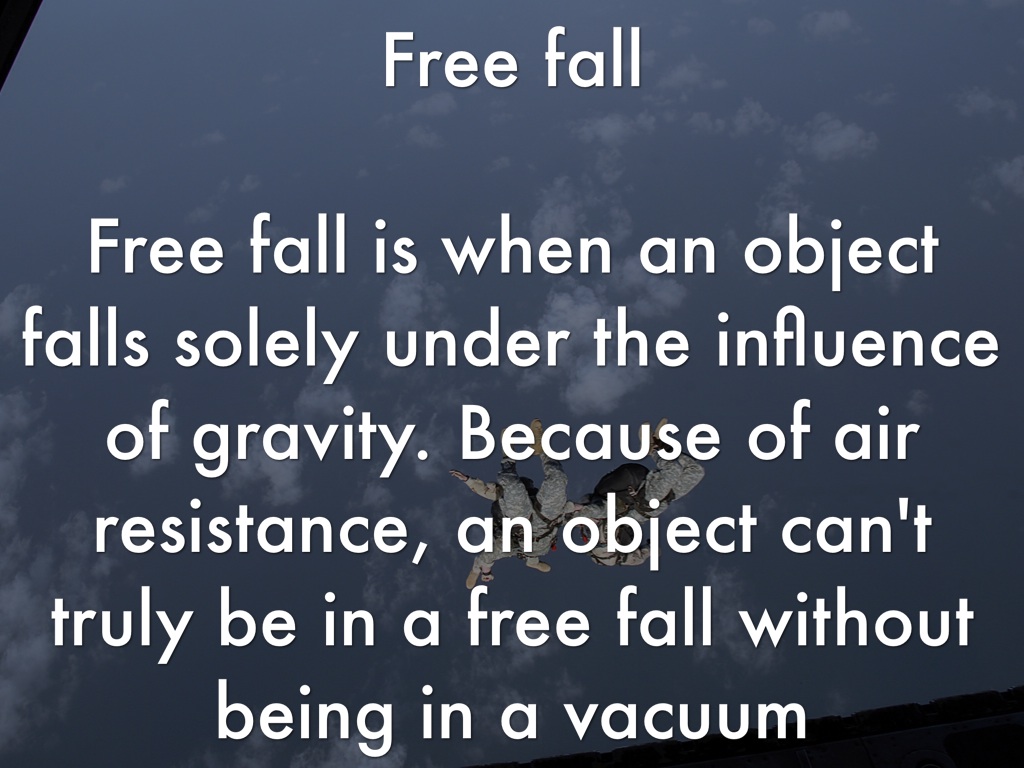 Free fall is when an object falls solely under the influence of gravity. Because of air resistance, an object can't truly be in a free fall without being in a vacuum