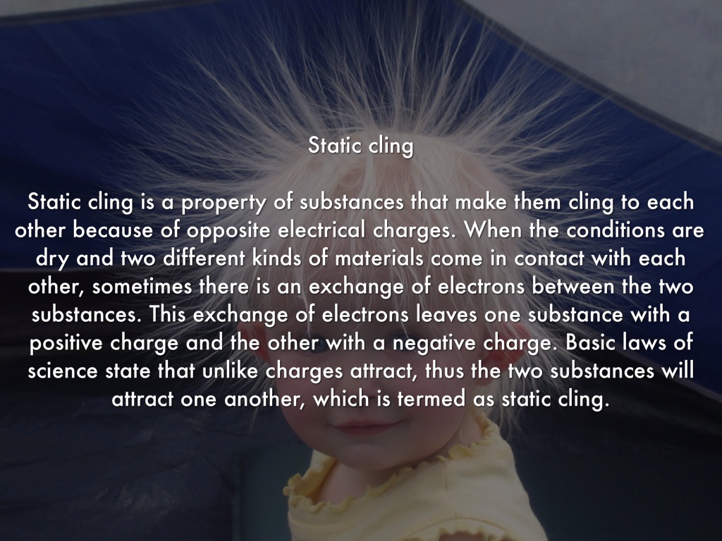 Static cling is a property of substances that make them cling to each other because of opposite electrical charges. When the conditions are dry and two different kinds of materials come in contact with each other, sometimes there is an exchange of electrons between the two substances. This exchange of electrons leaves one substance with a positive charge and the other with a negative charge. Basic laws of science state that unlike charges attract, thus the two substances will attract one another, which is termed as static cling.