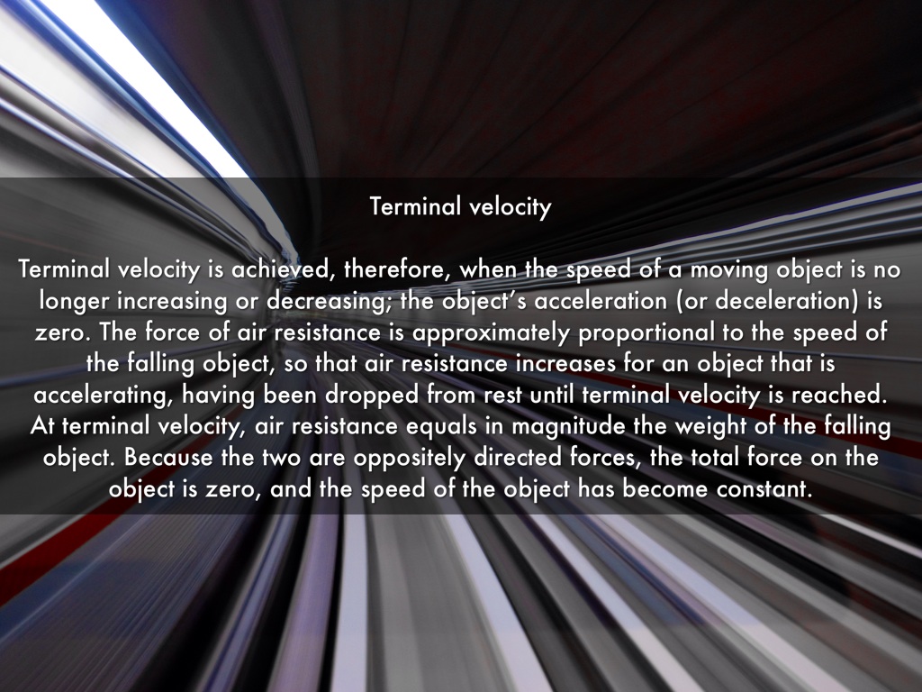 Terminal velocity is achieved, therefore, when the speed of a moving object is no longer increasing or decreasing; the object’s acceleration (or deceleration) is zero. The force of air resistance is approximately proportional to the speed of the falling object, so that air resistance increases for an object that is accelerating, having been dropped from rest until terminal velocity is reached. At terminal velocity, air resistance equals in magnitude the weight of the falling object. Because the two are oppositely directed forces, the total force on the object is zero, and the speed of the object has become constant.