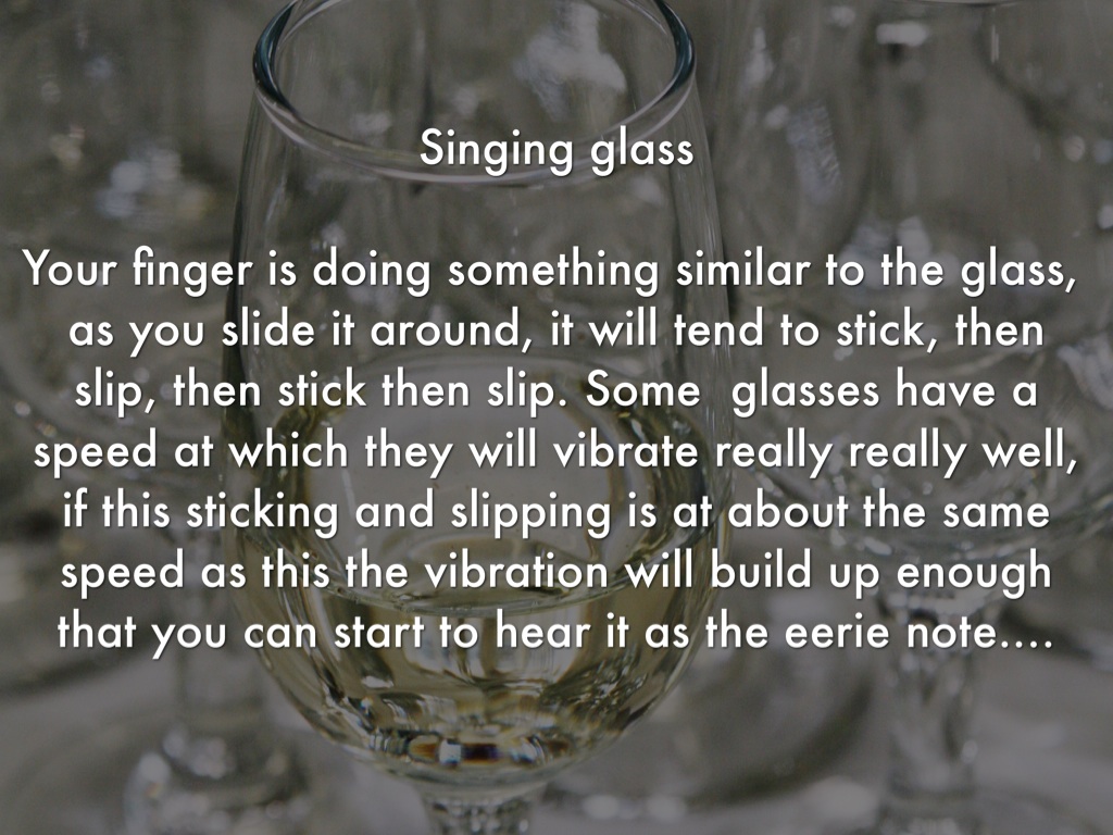 Your finger is doing something similar to the glass, as you slide it around, it will tend to stick, then slip, then stick then slip. Some glasses have a speed at which they will vibrate really really well, if this sticking and slipping is at about the same speed as this the vibration will build up enough that you can start to hear it as the eerie note.