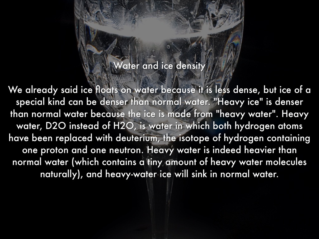We already said ice floats on water because it is less dense, but ice of a special kind can be denser than normal water. "Heavy ice" is denser than normal water because the ice is made from "heavy water". Heavy water, D2O instead of H2O, is water in which both hydrogen atoms have been replaced with deuterium, the isotope of hydrogen containing one proton and one neutron. Heavy water is indeed heavier than normal water (which contains a tiny amount of heavy water molecules naturally), and heavy-water ice will sink in normal water.