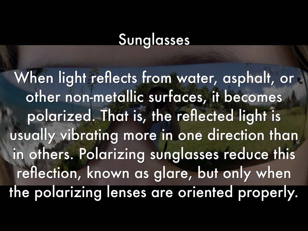 When light reflects from water, asphalt, or other non-metallic surfaces, it becomes polarized. That is, the reflected light is usually vibrating more in one direction than in others. Polarizing sunglasses reduce this reflection, known as glare, but only when the polarizing lenses are oriented properly.
