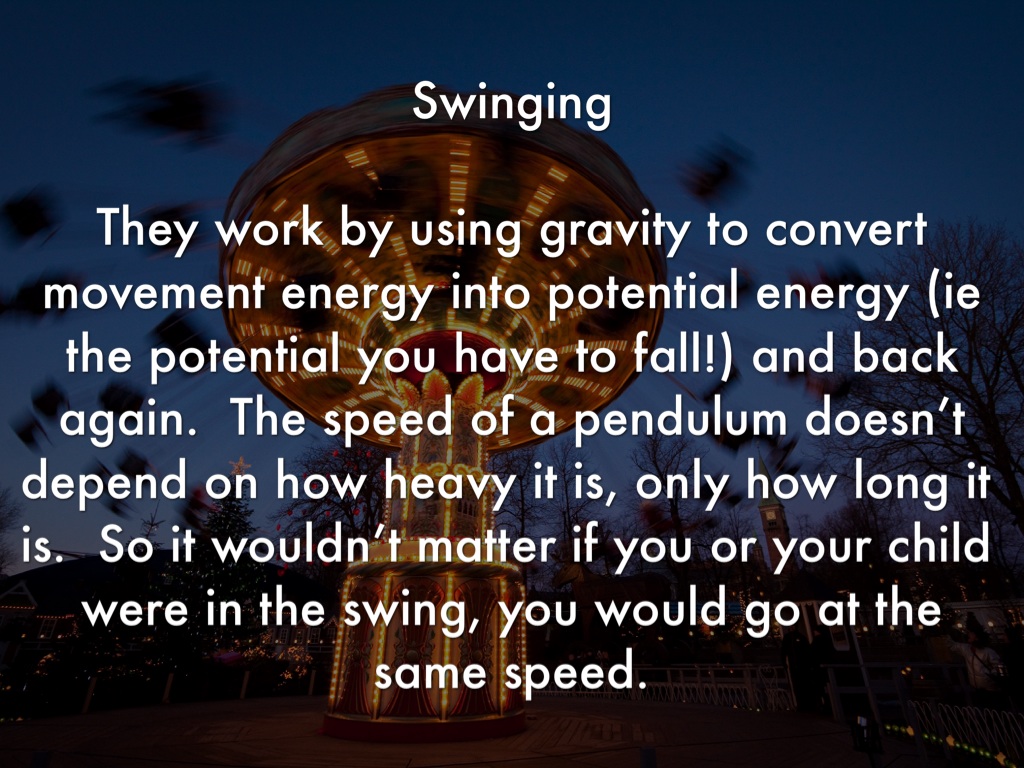 They work by using gravity to convert movement energy into potential energy (ie the potential you have to fall!) and back again. The speed of a pendulum doesn’t depend on how heavy it is, only how long it is. So it wouldn’t matter if you or your child were in the swing, you would go at the same speed.