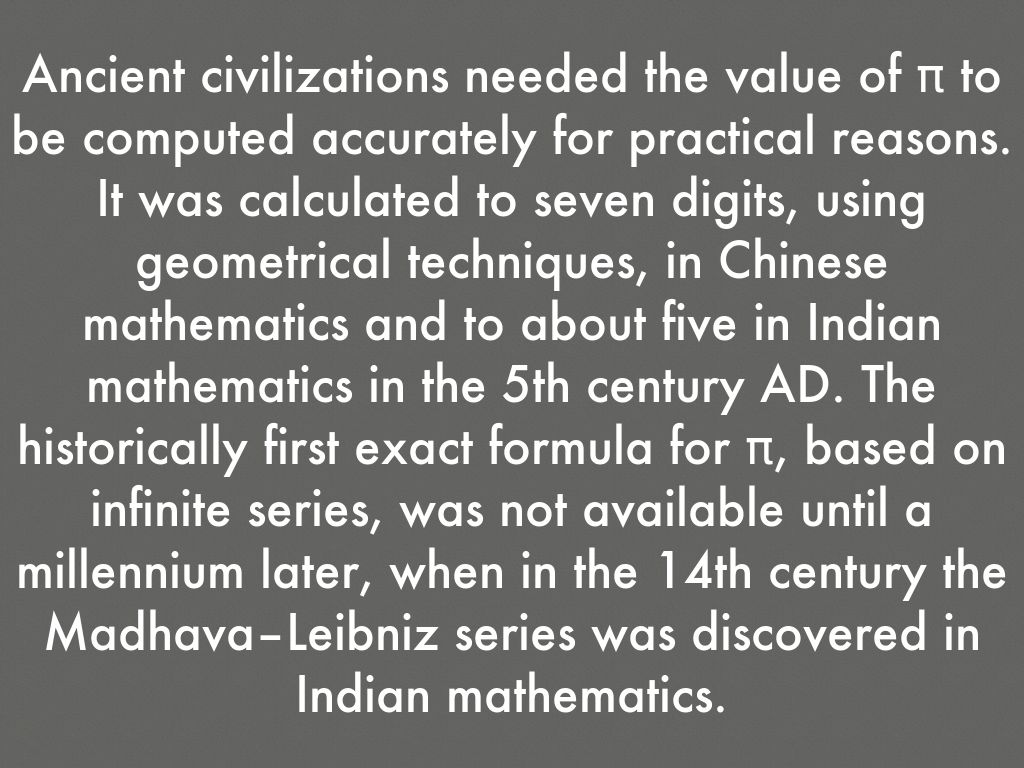 Ancient civilizations needed the value of π to be computed accurately for practical reasons. It was calculated to seven digits, using geometrical techniques, in Chinese mathematics and to about five in Indian mathematics in the 5th century AD. The historically first exact formula for π, based on infinite series, was not available until a millennium later, when in the 14th century the Madhava–Leibniz series was discovered in Indian mathematics.