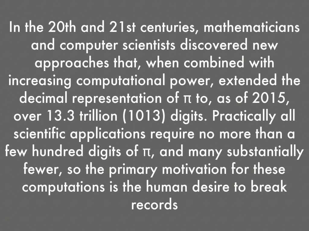 In the 20th and 21st centuries, mathematicians and computer scientists discovered new approaches that, when combined with increasing computational power, extended the decimal representation of π to, as of 2015, over 13.3 trillion (1013) digits. Practically all scientific applications require no more than a few hundred digits of π, and many substantially fewer, so the primary motivation for these computations is the human desire to break records