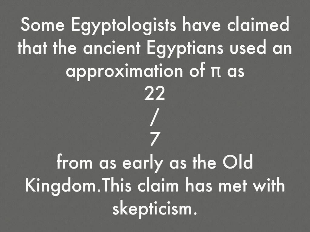 Some Egyptologists have claimed that the ancient Egyptians used an approximation of π as