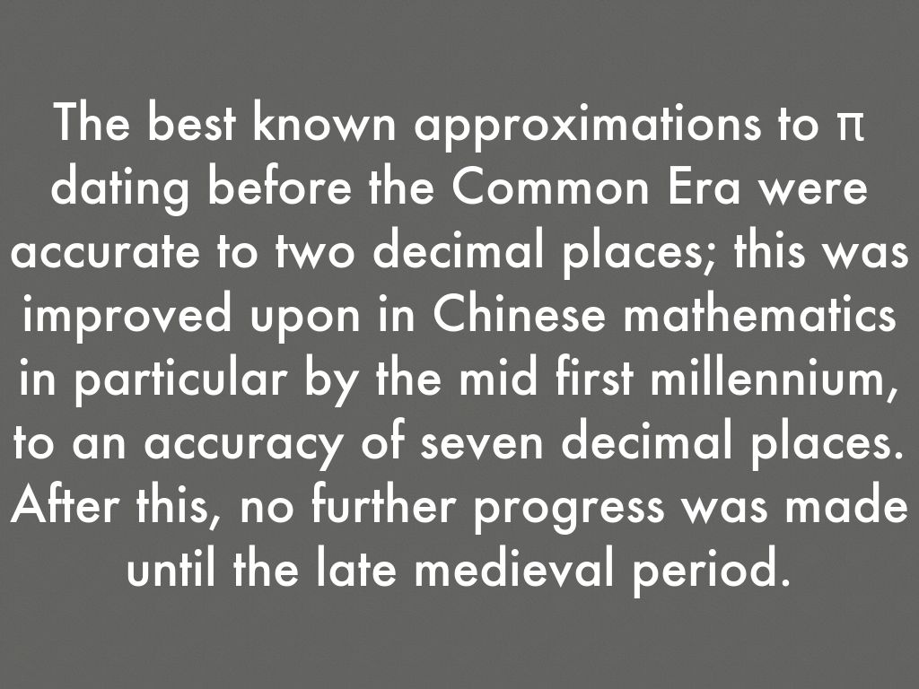 The best known approximations to π dating before the Common Era were accurate to two decimal places; this was improved upon in Chinese mathematics in particular by the mid first millennium, to an accuracy of seven decimal places. After this, no further progress was made until the late medieval period.