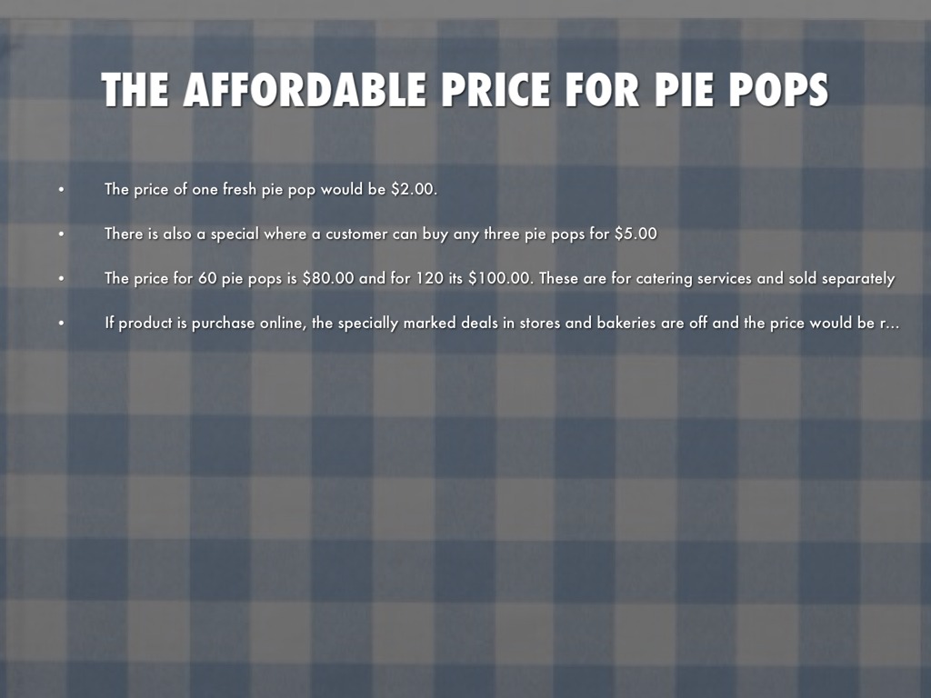 The price for 60 pie pops is $80.00 and for 120 its $100.00. These are for catering services and sold separately