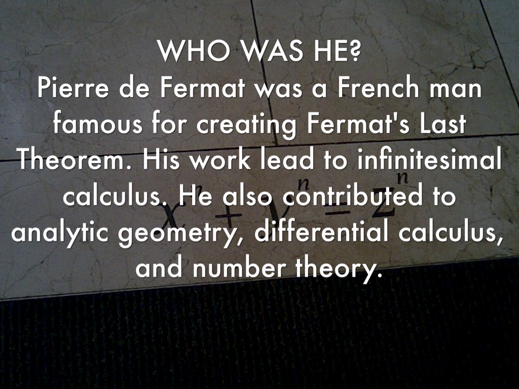 WHO WAS HE? Pierre de Fermat was a French man famous for creating Fermat's Last Theorem. His work lead to infinitesimal calculus. He also contributed to analytic geometry, differential calculus, and number theory.