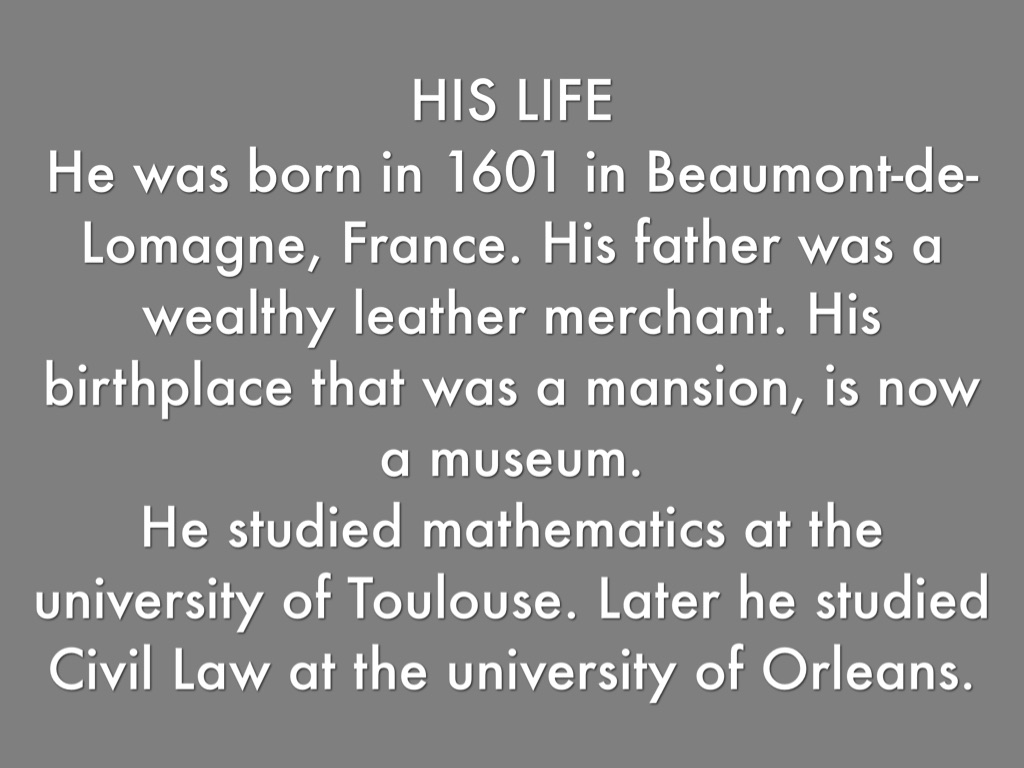 HIS LIFE He was born in 1601 in Beaumont-de-Lomagne, France. His father was a wealthy leather merchant. His birthplace that was a mansion, is now a museum. He studied mathematics at the university of Toulouse. Later he studied Civil Law at the university of Orleans.