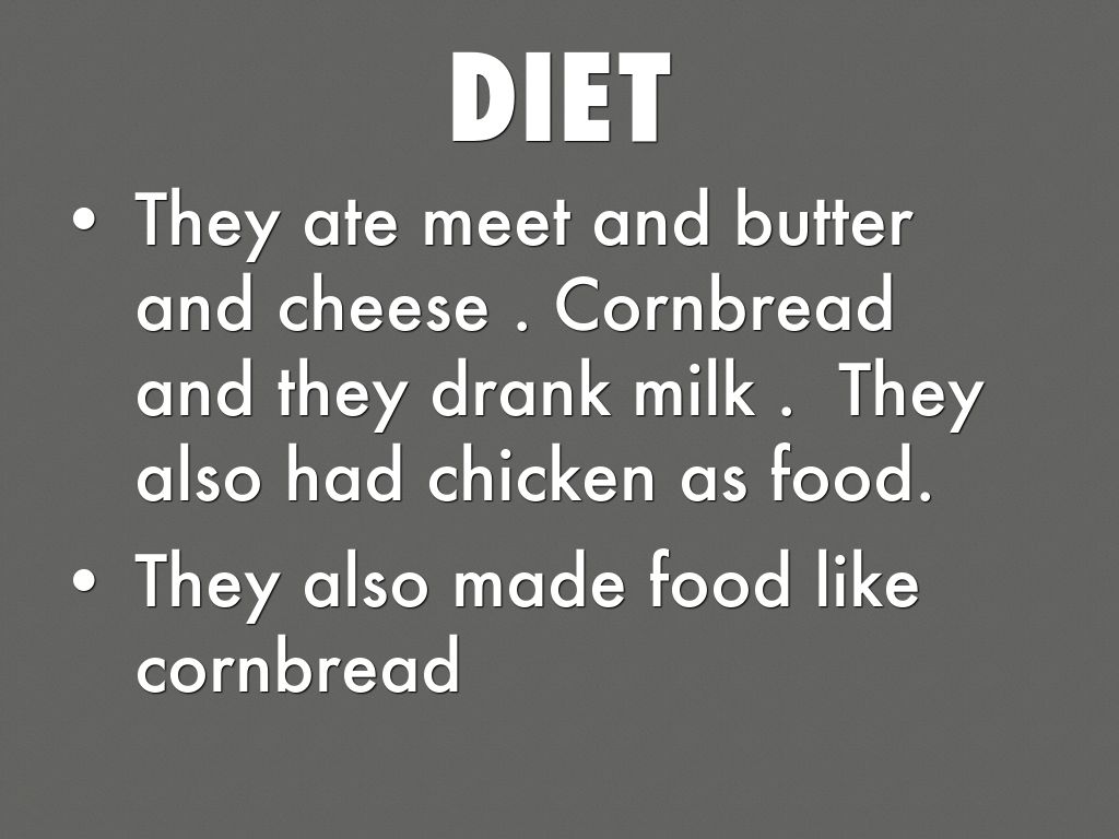 They ate meet and butter and cheese . Cornbread and they drank milk . They also had chicken as food.