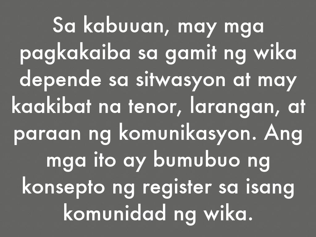 Sa kabuuan, may mga pagkakaiba sa gamit ng wika depende sa sitwasyon at may kaakibat na tenor, larangan, at paraan ng komunikasyon. Ang mga ito ay bumubuo ng konsepto ng register sa isang komunidad ng wika.