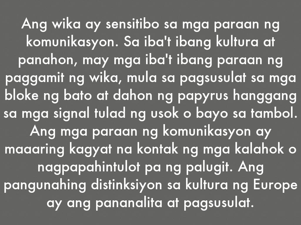 Ang wika ay sensitibo sa mga paraan ng komunikasyon. Sa iba't ibang kultura at panahon, may mga iba't ibang paraan ng paggamit ng wika, mula sa pagsusulat sa mga bloke ng bato at dahon ng papyrus hanggang sa mga signal tulad ng usok o bayo sa tambol. Ang mga paraan ng komunikasyon ay maaaring kagyat na kontak ng mga kalahok o nagpapahintulot pa ng palugit. Ang pangunahing distinksiyon sa kultura ng Europe ay ang pananalita at pagsusulat.