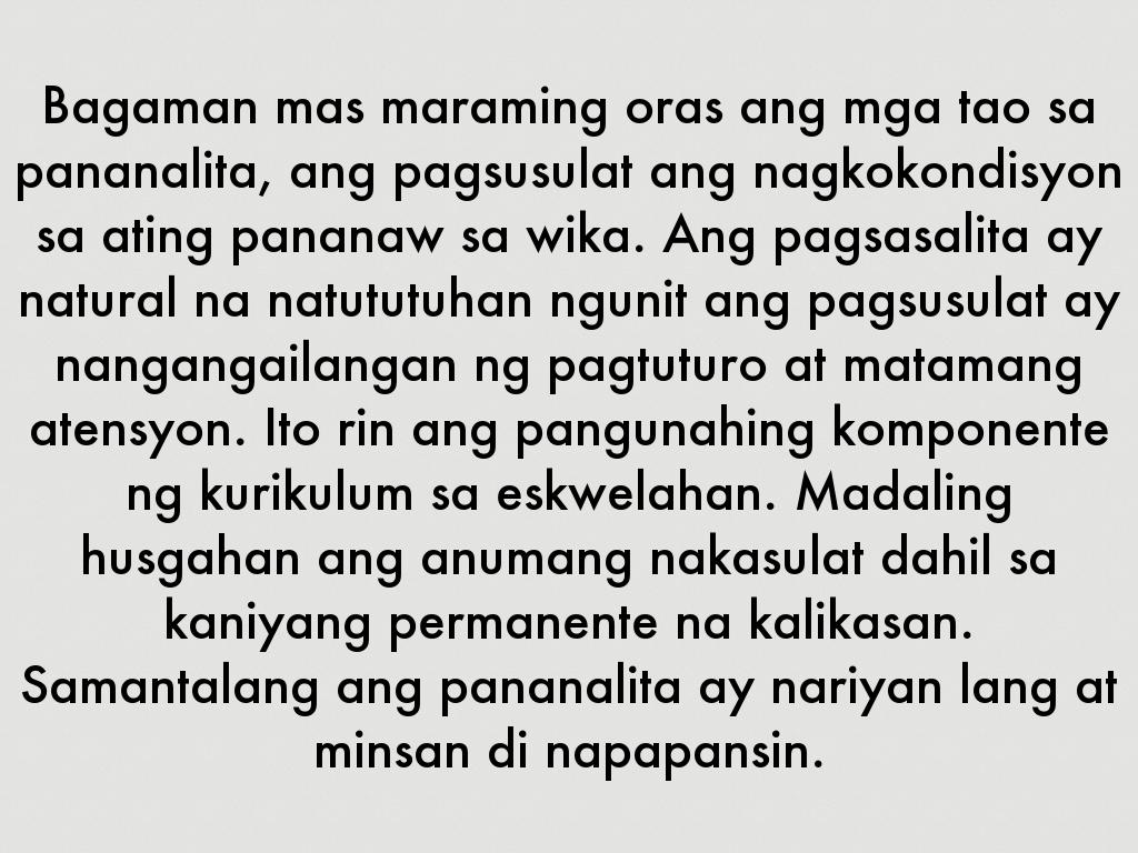 Bagaman mas maraming oras ang mga tao sa pananalita, ang pagsusulat ang nagkokondisyon sa ating pananaw sa wika. Ang pagsasalita ay natural na natututuhan ngunit ang pagsusulat ay nangangailangan ng pagtuturo at matamang atensyon. Ito rin ang pangunahing komponente ng kurikulum sa eskwelahan. Madaling husgahan ang anumang nakasulat dahil sa kaniyang permanente na kalikasan. Samantalang ang pananalita ay nariyan lang at minsan di napapansin.