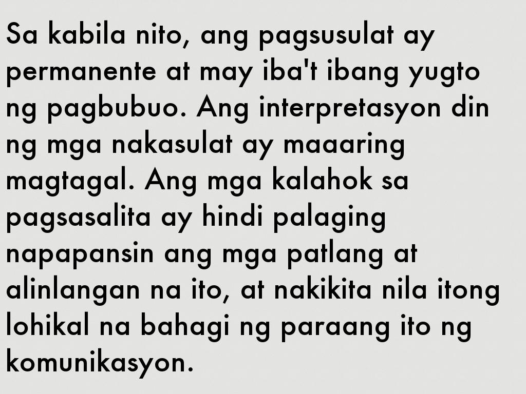 Sa kabila nito, ang pagsusulat ay permanente at may iba't ibang yugto ng pagbubuo. Ang interpretasyon din ng mga nakasulat ay maaaring magtagal. Ang mga kalahok sa pagsasalita ay hindi palaging napapansin ang mga patlang at alinlangan na ito, at nakikita nila itong lohikal na bahagi ng paraang ito ng komunikasyon.