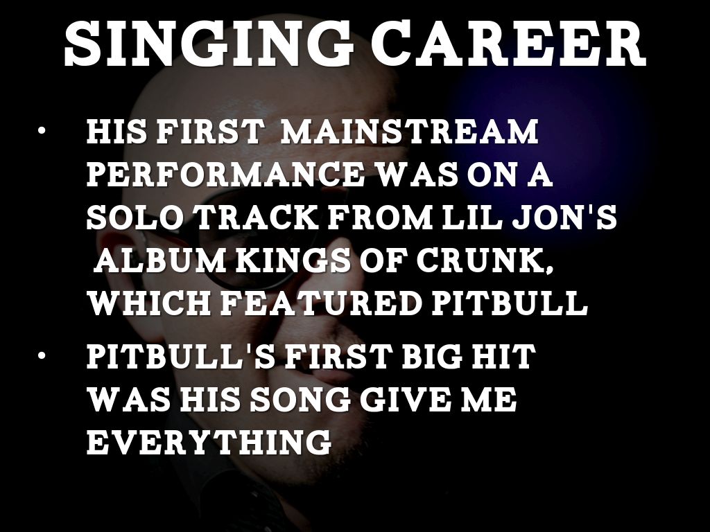 His first mainstream performance was on a solo track from Lil Jon's album Kings of Crunk, which featured Pitbull