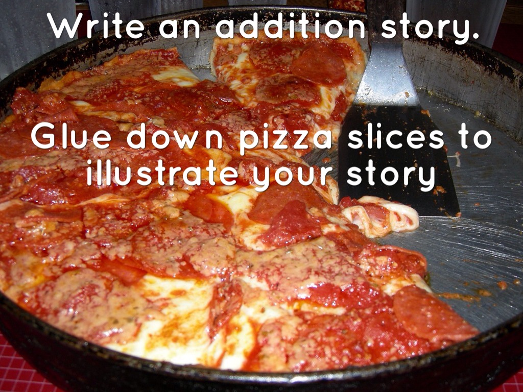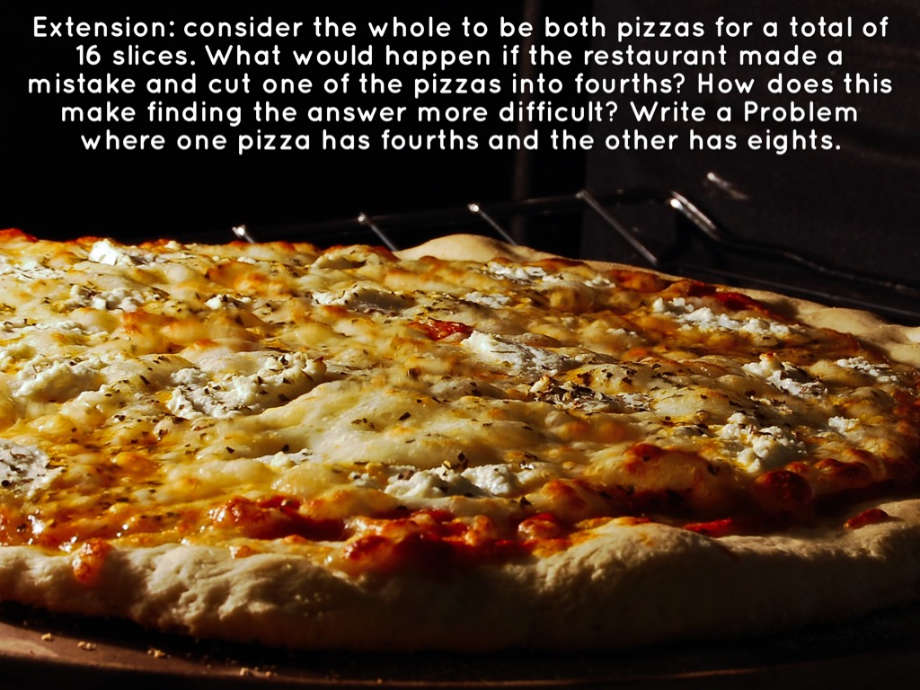Extension: consider the whole to be both pizzas for a total of 16 slices. What would happen if the restaurant made a mistake and cut one of the pizzas into fourths? How does this make finding the answer more difficult? Write a Problem where one pizza has fourths and the other has eights.